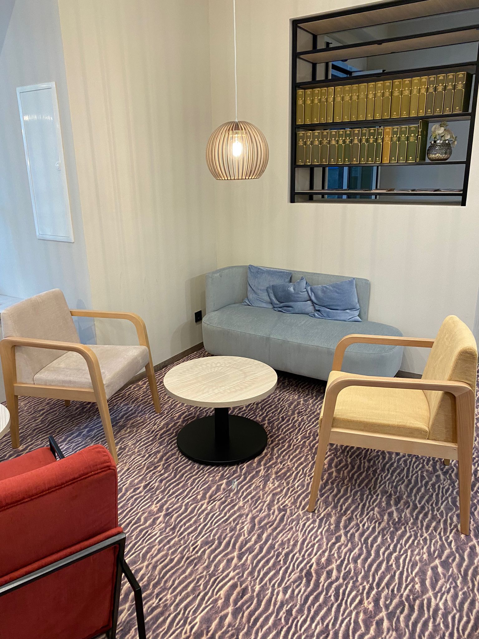 Der Lounge Bereich befindet sich auf einem Teppich im Sand Design, um Wärme und Erholung zu vermitteln. Die verschiedenen Bodenbeläge weisen eine gute Wegführung auf. Die Einrichtung ist nordisch inspiriert: sanfte Farben, natürliche Materialien und klare Linien.