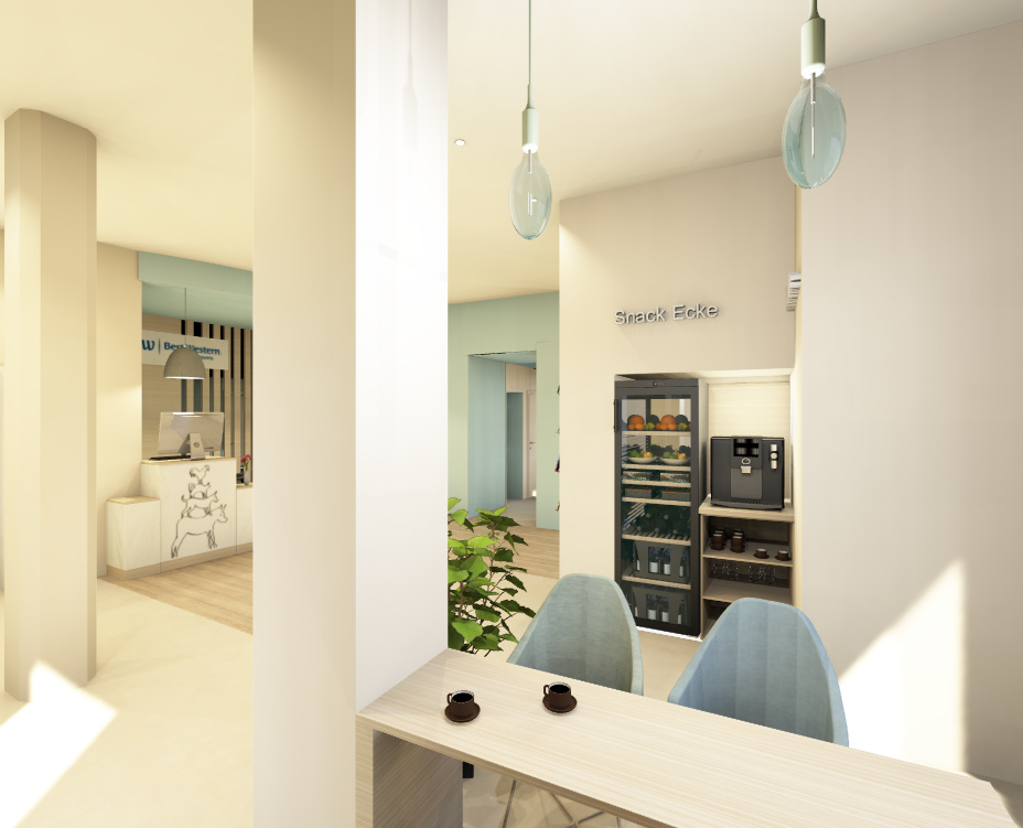 Wir haben den vorhandenen Grundriss analysiert und in enger Absprache mit dem Kunden etwas verändert und umgebaut. Der Empfangsbereich sollte dem Gast gegenüber optisch geöffnet werden. Gewünscht war zusätzlich eine kleine Snack Ecke und ein Wartebereich in der Lobby.