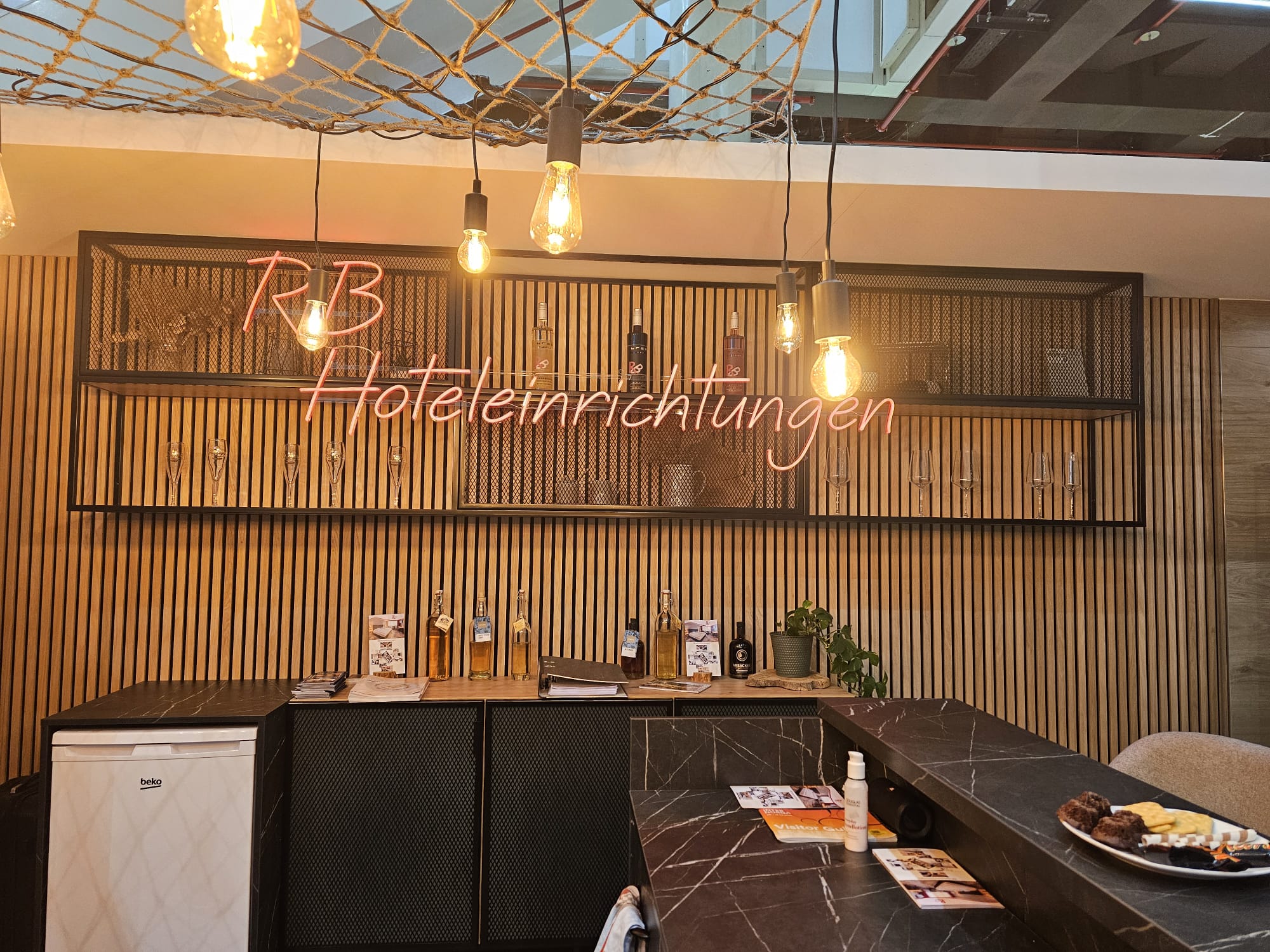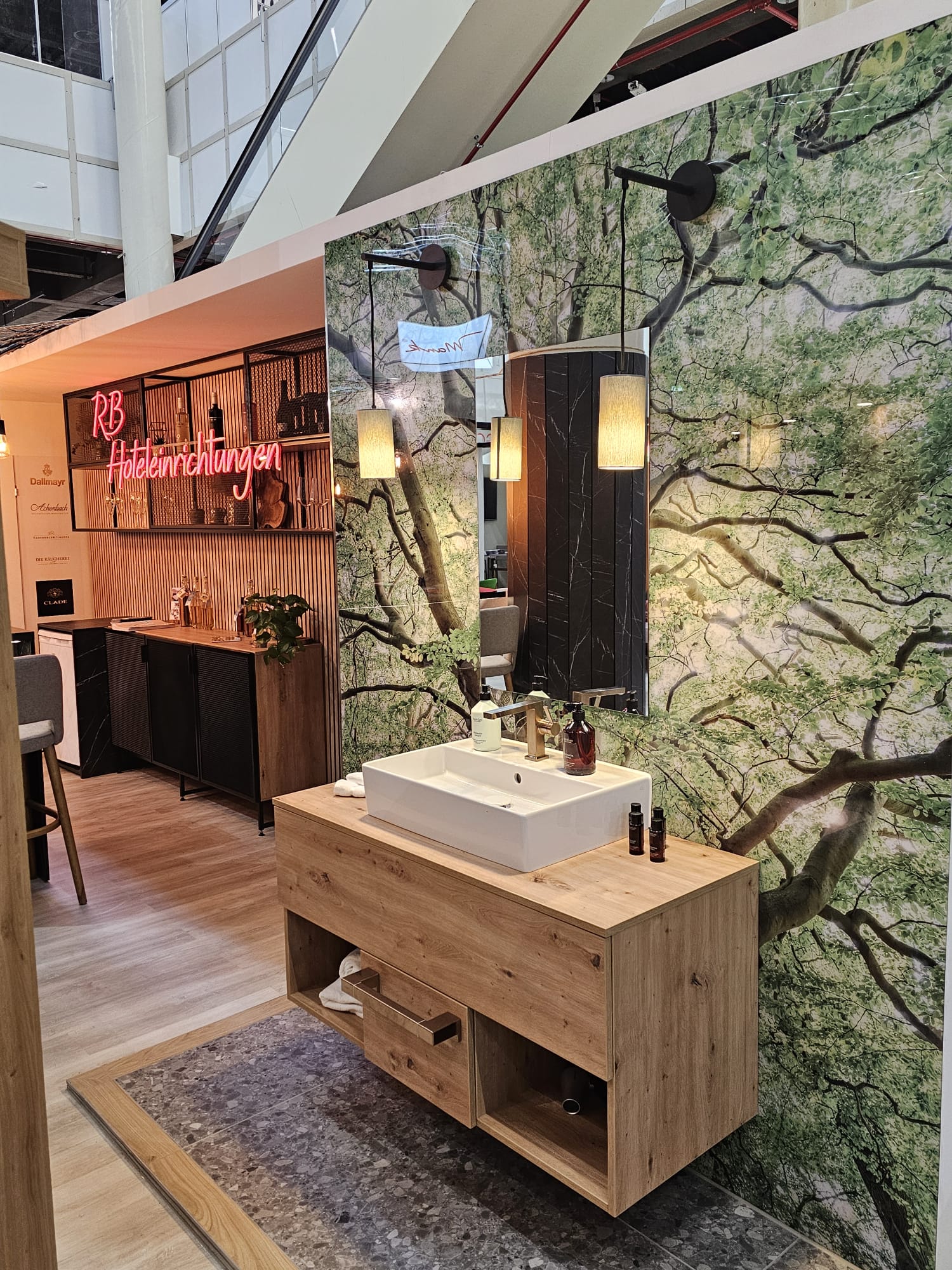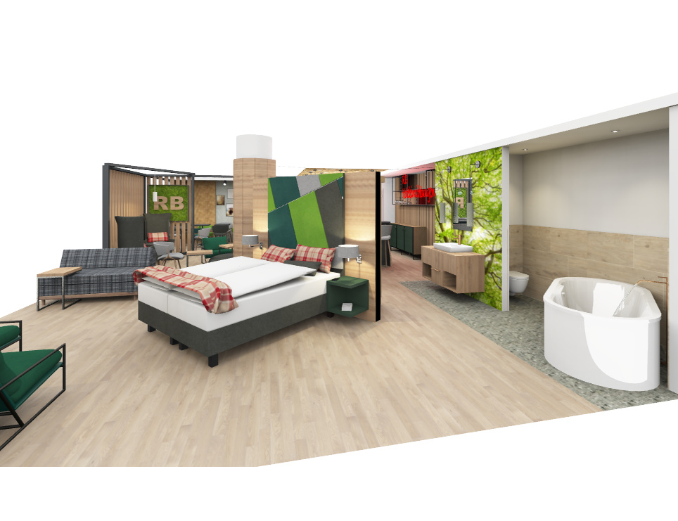 Der Wunsch des Kunden war ein moderner, offener Messestand im modernen Landhausstil. Thema des Standes ist der Hotelbereich mit Zimmer, Lobby, Bar, Restaurant.
