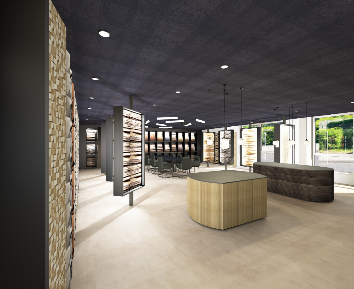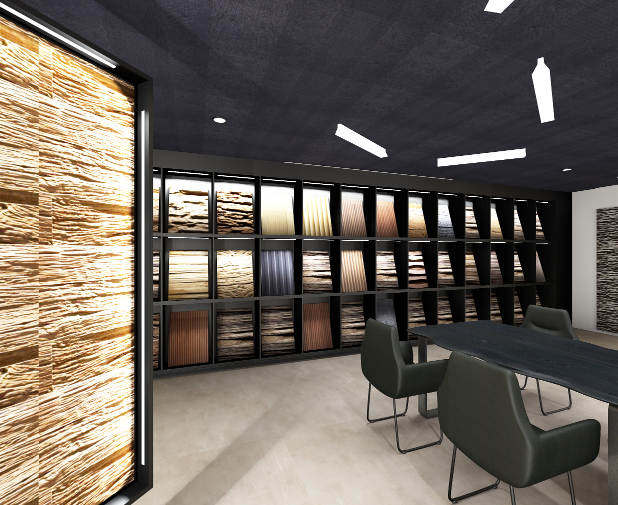 Die Kunden wünschten sich einen neuen, modernen Ausstellungsraum, der die Holzprodukte in verschiedene Szenarien darstellt.