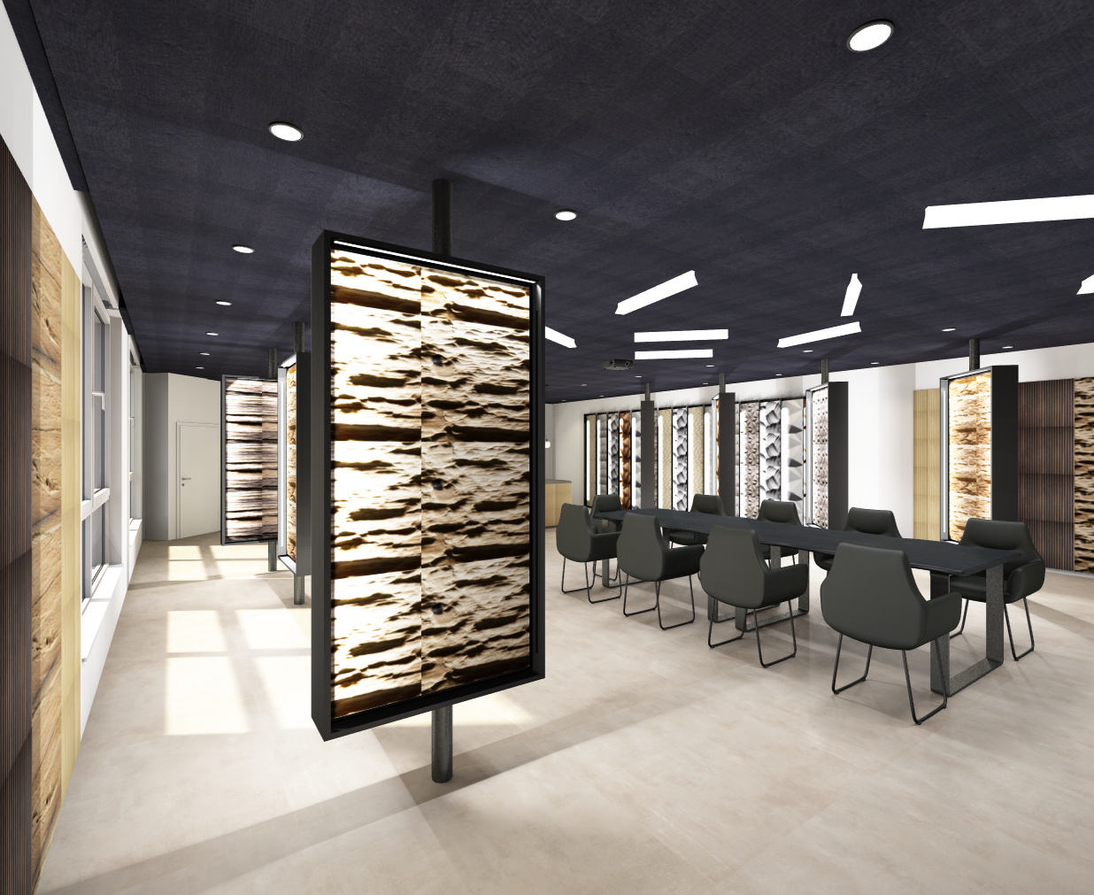 Für den Showroom haben wir ein Lichtkonzept entwickelt, das auf die verschiedenen Zonen wie Beratung, Besprechung, Präsentationen etc. abgestimmt ist.